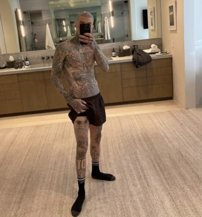 Por medio de su cuenta de Instagram, el baterista de Blink-182 presumió la marca de tinta que homenajea a la mayor de las Kardashian con sus ojos en el muslo, ante el asombro de sus fans.