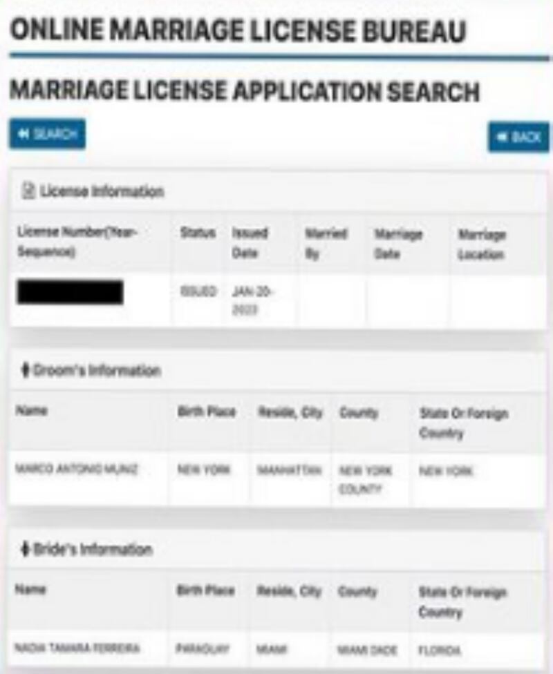 Según los documentos obtenidos por diversos medios de comunicación, la pareja solicitó el permiso para casarse el 20 de enero en el Tribunal del condado de Miami, Florida. Debido a ello, se especuló que las celebridades habían contraído matrimonio el sábado 21, sin embargo, no fue así.