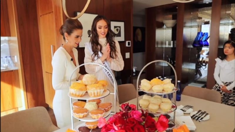 Como si sus deseos fuesen órdenes, en una de sus últimas ruedas de prensa ocurrida este miércoles, la reportera de ABS-CBN News Dyan Castillejo, preparó como sorpresa un buffet de ensaymadas para la entrevista que realizó desde Nueva York, la ciudad en la que reside la texana tras recibir un departamento como uno de los beneficios por su triunfo en el popular certamen de belleza.