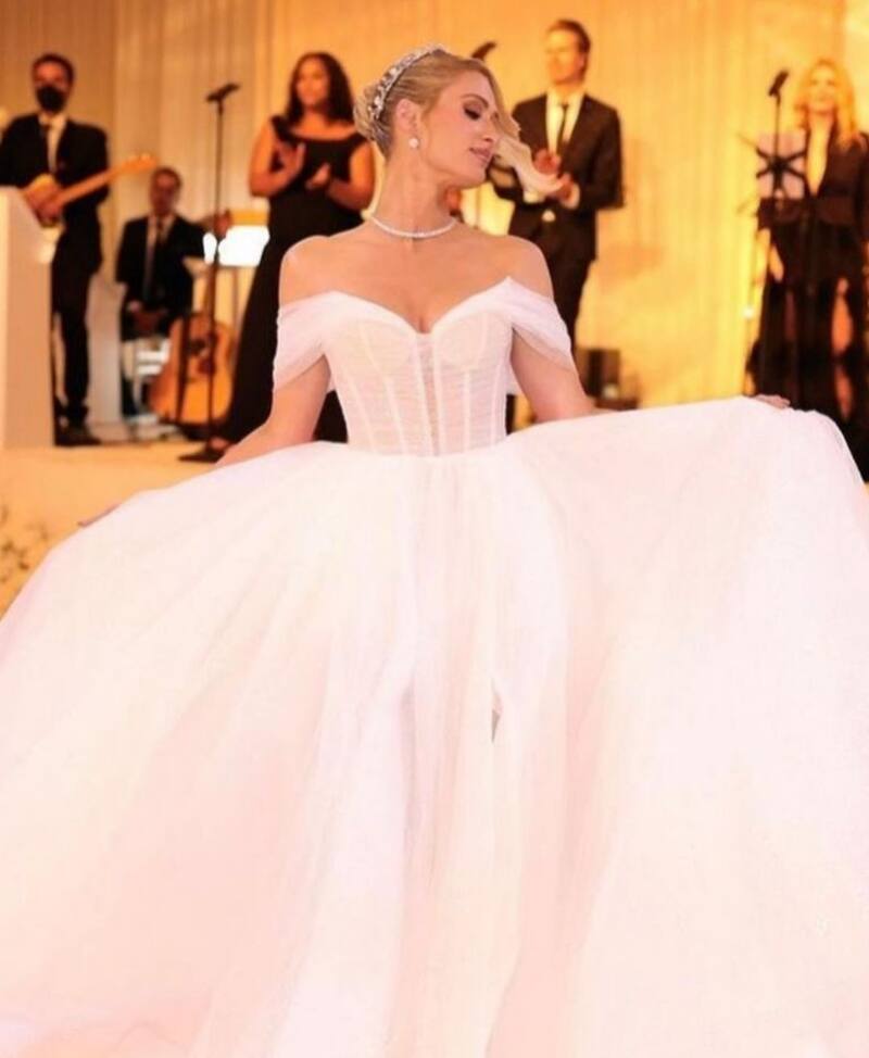 El segundo outfit, y más cómodo para la fiesta, es un seductor y sofisticado modelo con escote de corazón y falda corta con una aplicación de tul para la parte trasera con detalles de brillo, que de acuerdo con la revista, se apodera de los bordados sustituyendo o complementando las aplicaciones de encaje y tela del vestido principal.