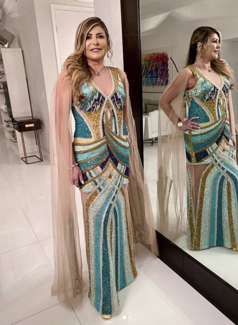 La prenda era de tonos azules y dorados que en el pecho tenía un corte en forma de corazón y tenía incrustaciones de brillantes, sin embargo la venezolana ha sido acusada por un diseñador quien asegura que su vestido fue plagiado.