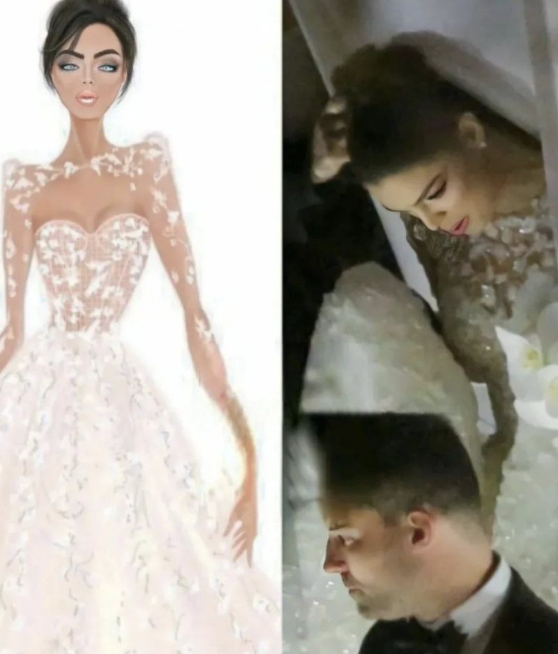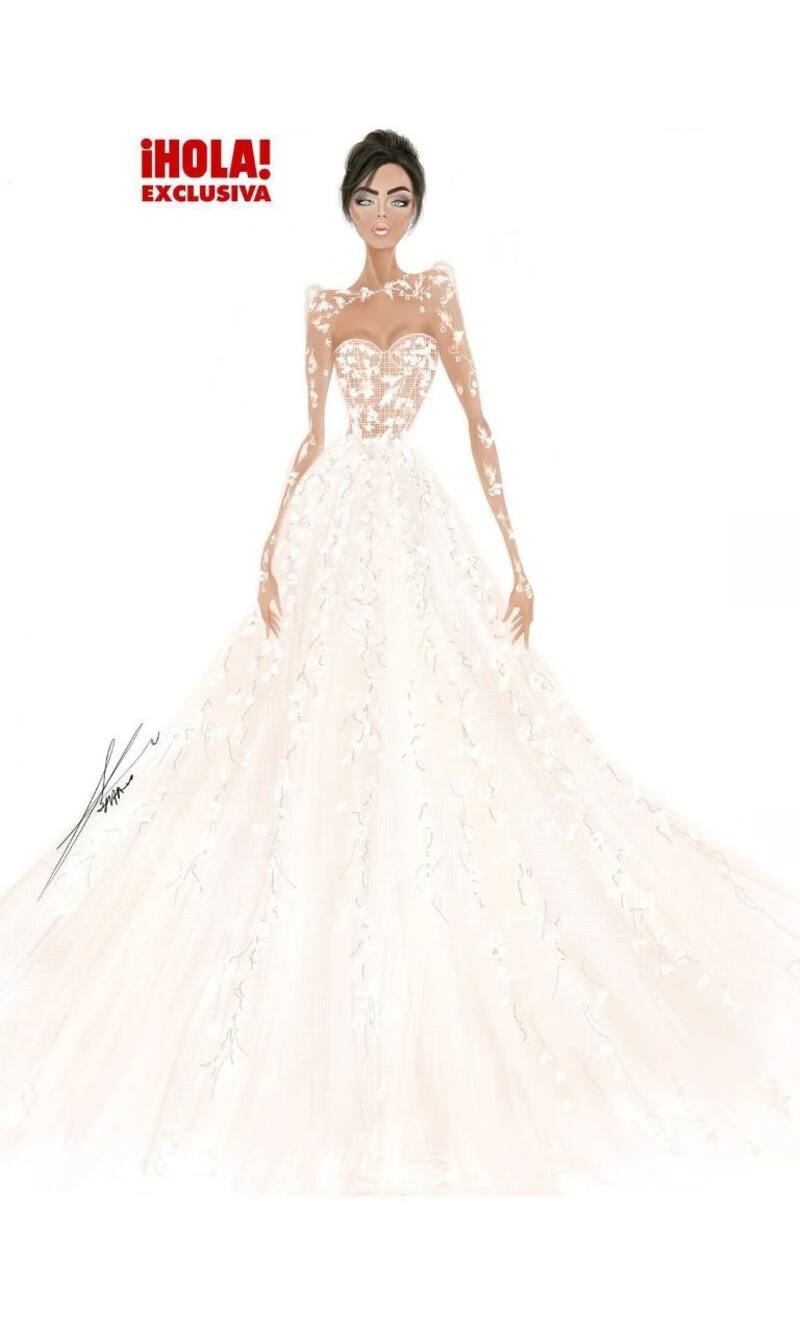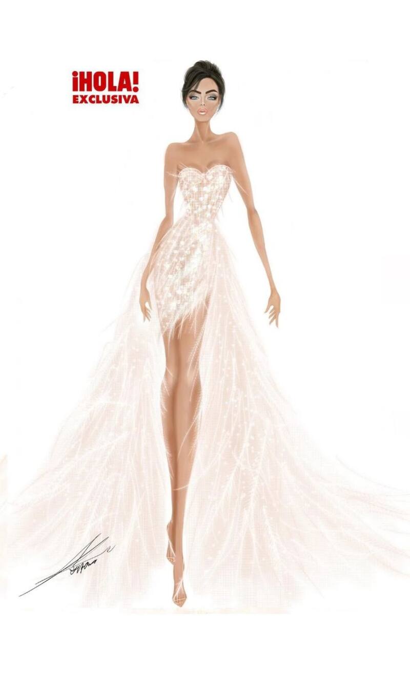 Según el medio, la prenda que usó durante la ceremonia consistía en una falda larga de tul con un degradé de bordado que va desde el torso hasta la cauda y el bustier tenía un escote en forma de corazón. Además, la modelo portó una torera de tul de manga larga con encaje bordado.