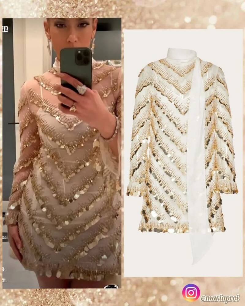 Para la tan especial ocasión JLo presumió un look bastante llamativo, un vestido con trasparencias en color blanco adornado con lentejuelas en tono dorado de Valentino. Su mini vestido lució aún más con el tocado de la actriz, quien optó por llevar el cabello recogido en chongo. Si bien parece una casualidad los fans no han dejado pasar desapercibido el momento.