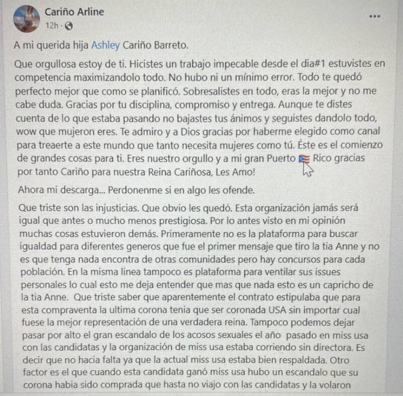 “Qué triste saber que aparentemente el contrato estipulaba que para esta compraventa la última corona tenía que ser coronada USA sin importar cual fuese la mejor representación de una verdadera reina”, escribió Arline en su cuenta de Facebook. Además de ello, señaló que ni la representante de República Dominicana ni la de Venezuela merecían estar entre las tres finalistas.