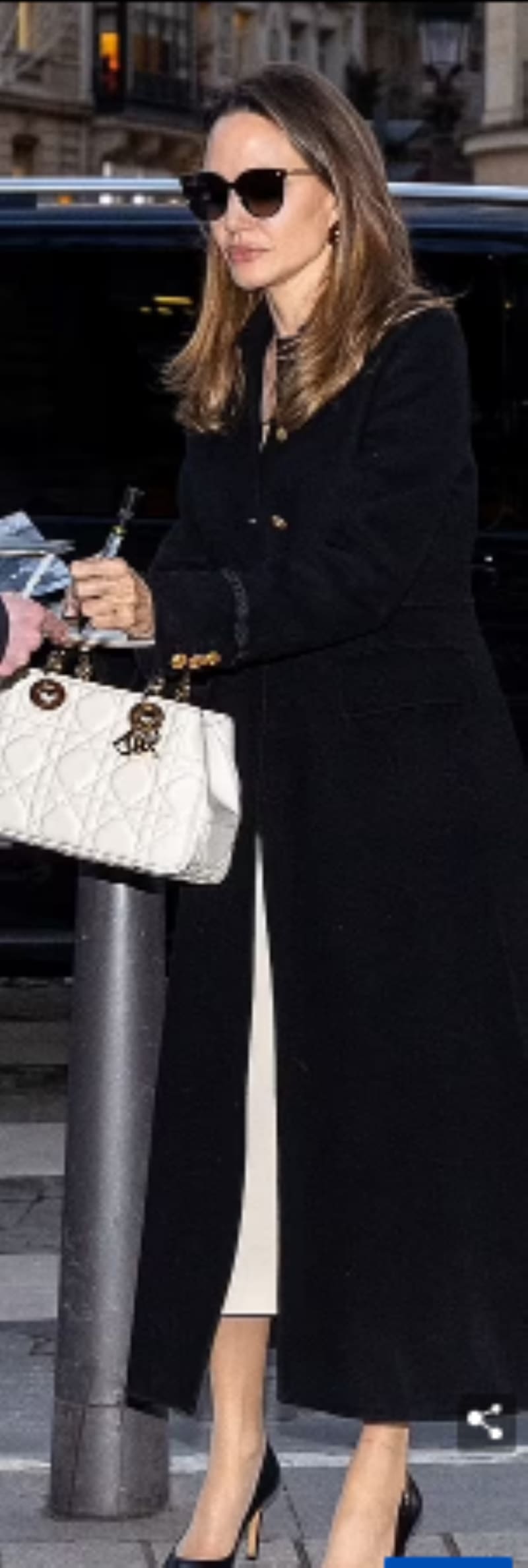 La actriz llevaba un vestido largo color crema combinado con un largo abrigo de noche en un tono oscuro, el cual completó con unas gafas de sol negras. La directora y productora estadounidense combinó su look con unos zapatos altos de tacos en color negro y un elegante bolso.