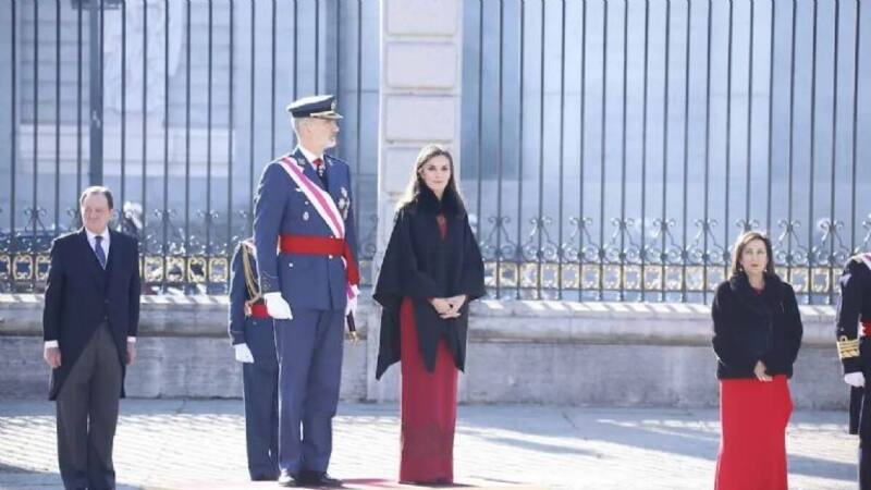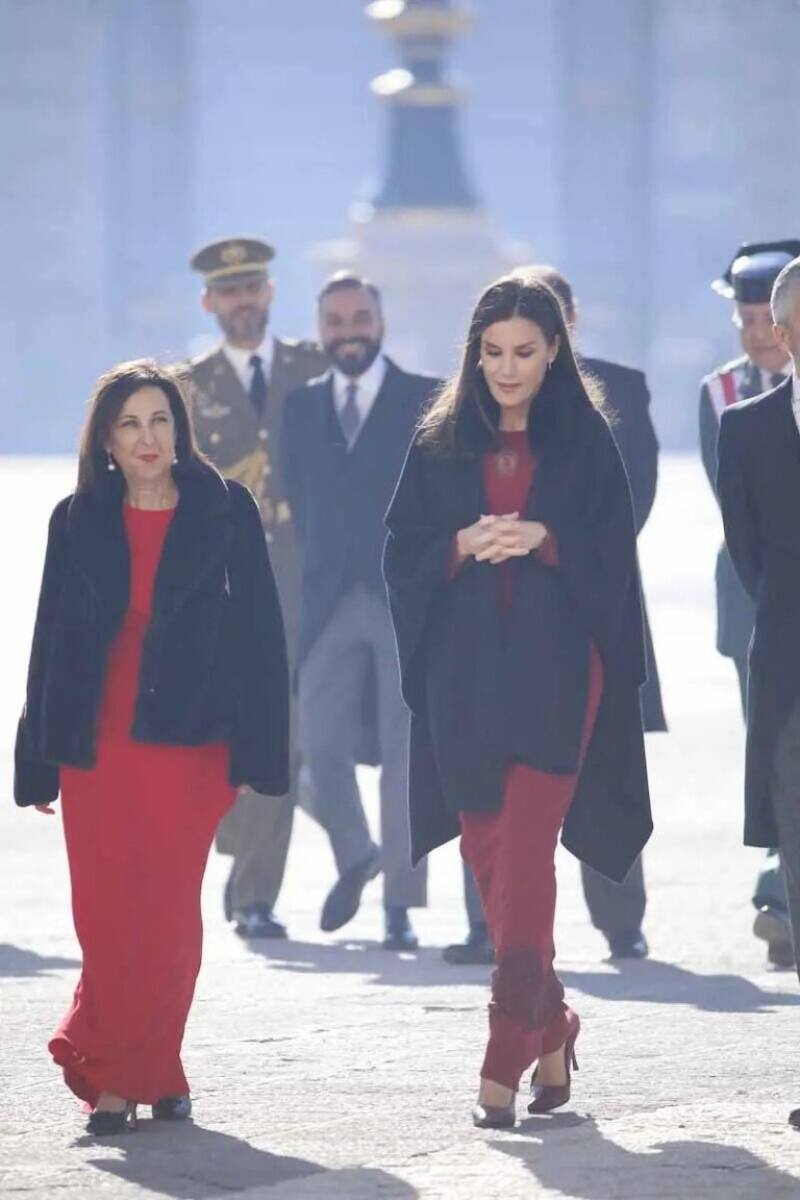 Sin embargo, su elegante atuendo se vio empañado por la presencia de una invitada importante en la ceremonia. La ministra de Defensa, Margarita Robles Fernández, llegó al evento luciendo un vestido rojo con un abrigo negro que le dio una apariencia similar a la de la monarca.