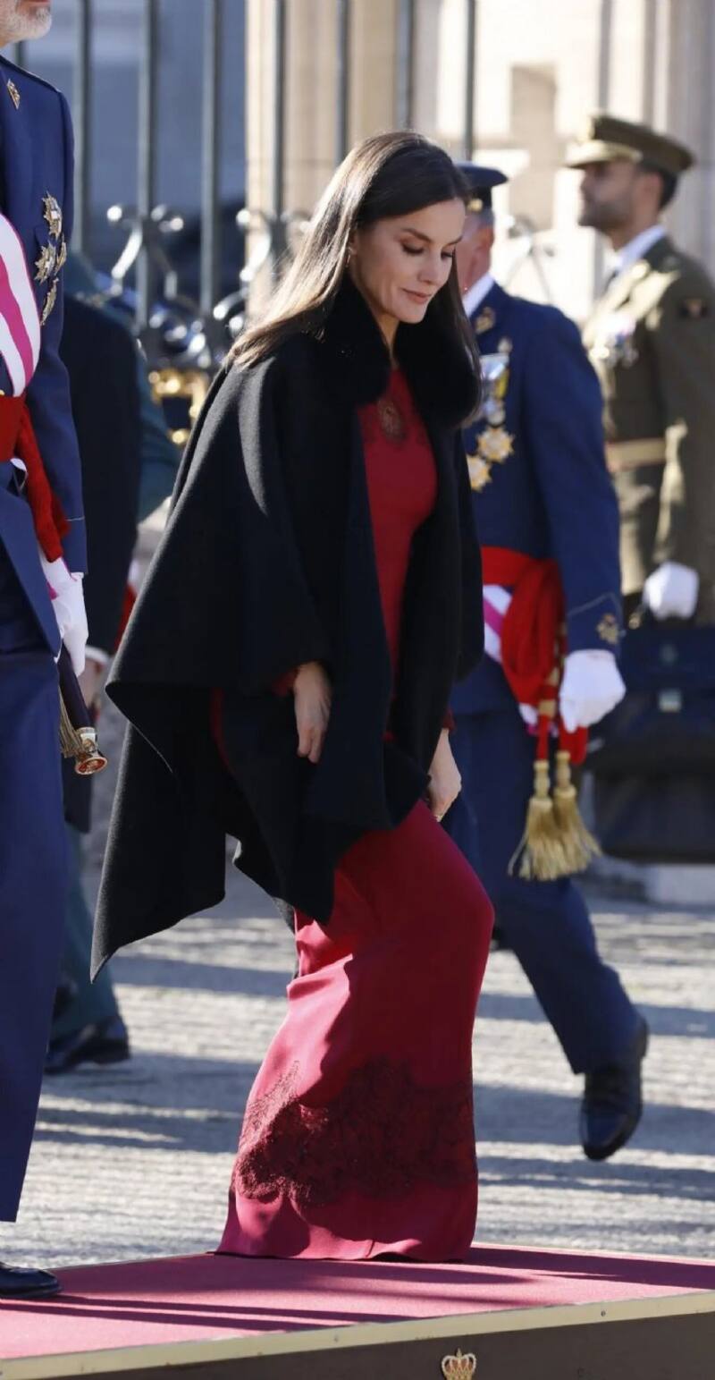 Su Majestad se robó las miradas al lucir un vestido ajustado y recto del reconocido modisto español Felipe Varela. Si bien Letizia acostumbraba a usar prendas del diseñador, desde hace ya varios años que la reina no adquiere una nueva pieza de él. Debido al clima de no temperatura baja, completó su outfit usando su elegante capa negra de Carolina Herrera.