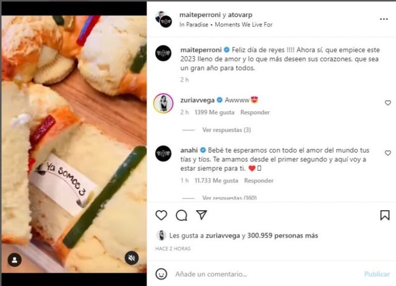 Hace unas horas y después de muchas especulaciones, Maite Perroni (39) y su esposo Andrés Tovar (41) anunciaron que están esperando un bebé de una peculiar manera, ya que fue cortando una rosca de reyes que dieron la noticia “Ya somos tres”, y fue la ex esposa del productor, Clauda Martín (33), quien reaccionó a la noticia.