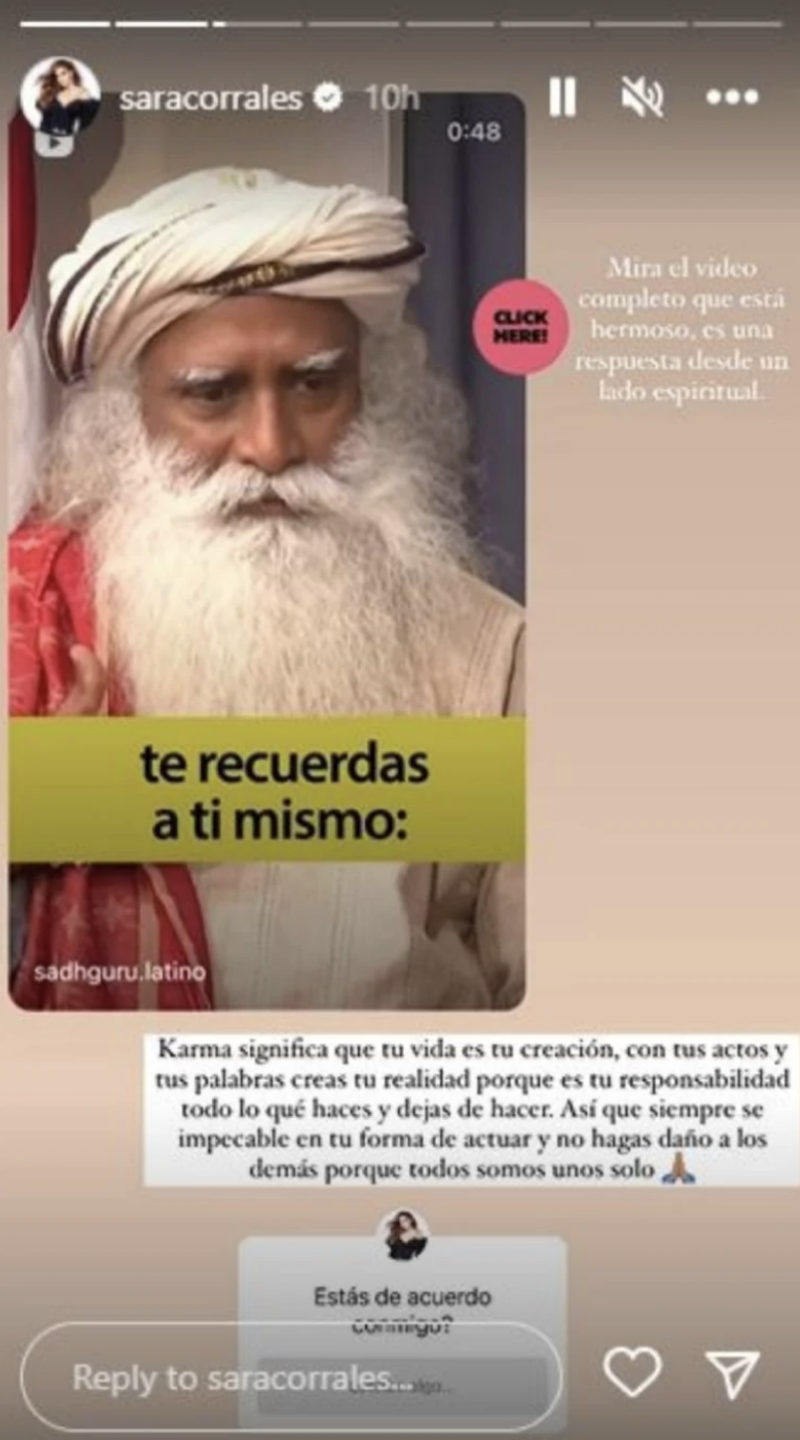 Y en medio de todos los rumores, Sara Corrales subió un mensaje que causó mucho revuelo entre sus seguidores ya que dio su propia definición de ‘karma’, como si se tratara de una indirecta.