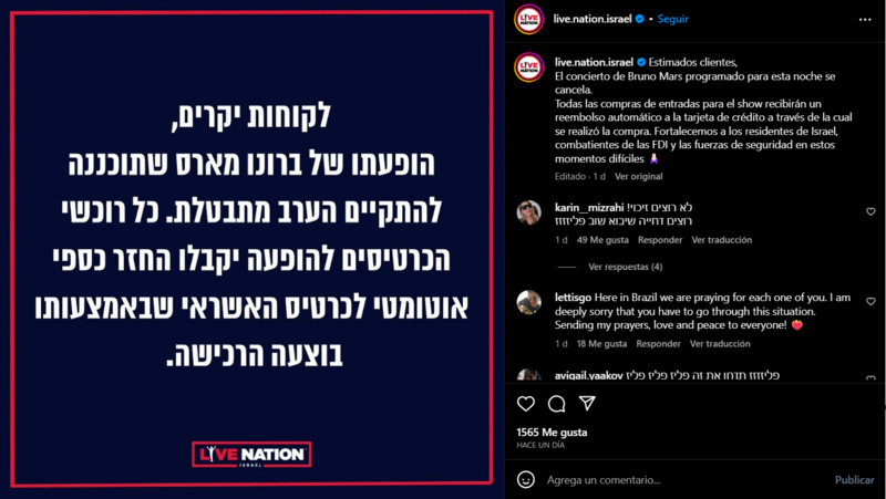 “El concierto de Bruno Mars programado para esta noche está cancelado”, anunciaron desde Live Nation Israel, sello encargado del espectáculo.