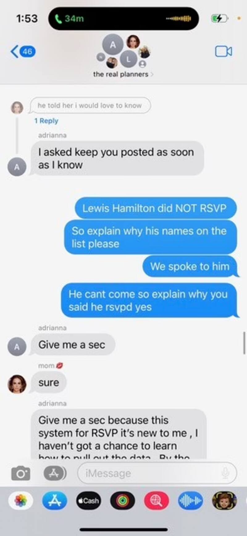 “Lewis Hamilton NO confirmó su asistencia. Así que expliquen por qué su nombre está en la lista, por favor”, se lee en uno de los textos. La excusa de Grijalba a Nicola fue que necesitaba más tiempo para familiarizarse con la aplicación donde estaba la lista de invitados virtual. Un ejemplo de la ineficiencia por la que el multimillonario Nelson Peltz quiere recuperar los 159 mil dólares.