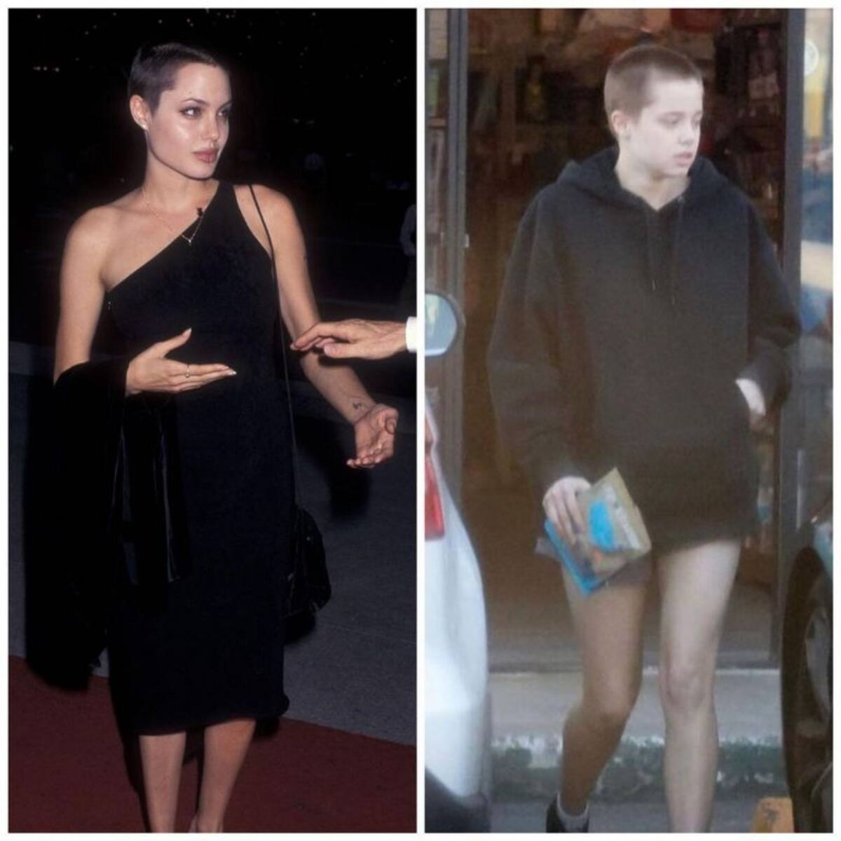 Su cabello ha crecido muy poco o ha sido objeto de un nuevo y sutil recorte desde la última vez que fue vista, y claramente recuerda uno de los looks que usó su padre en algún momento. Brad Pitt usó su pelo rapado y su barba totalmente afeitada en el 2004, cuando aún estaba casado con Jennifer Aniston.