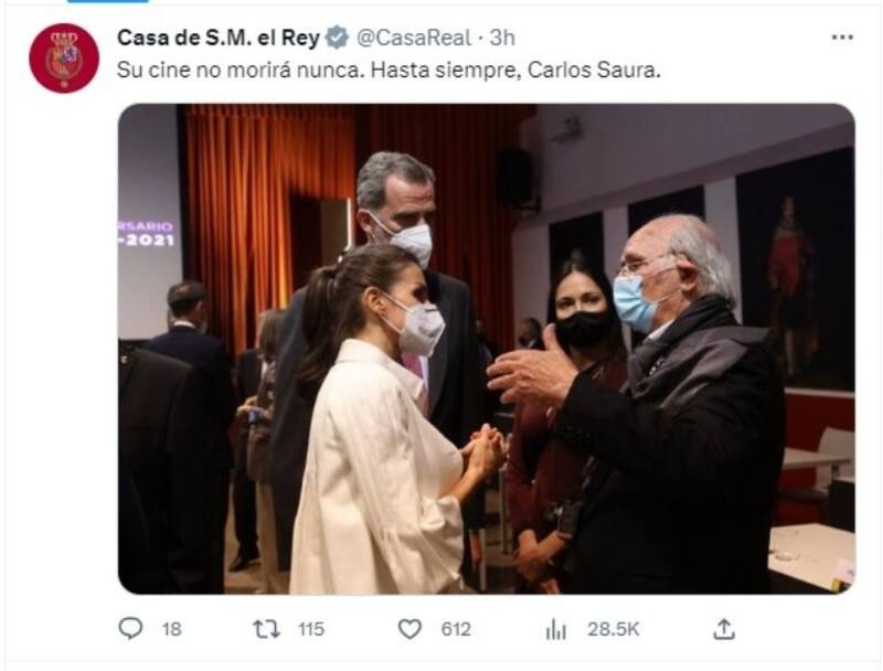 A través de su cuenta de Instagram, la reina Letizia (50 años) y el rey Felipe VI (54 años) mostraron sus condolencias con un sentido mensaje: “Su cine no morirá nunca. Hasta siempre, Carlos Saura”, en el cual aparece la pareja real al lado del laureado directo, una fotografía tomada durante la pandemia, dado que todos aparecen con su cubrebocas. Saura recibiría este sábado el Goya de Honor.