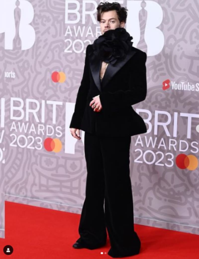 El intérprete de As It Was hizo una gran entrada a los premios con un traje totalmente en negro acampanado en la parte superior y acompañó con una gran rosa en el cuello.