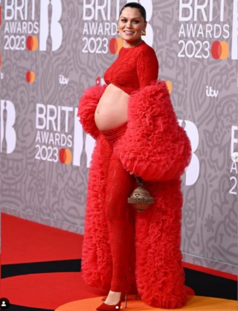 La compositora británica enloqueció a sus fans al llegar a la alfombra roja con su panza de embarazada totalmente descubierta, luciendo un top corto rojo con mallas de encaje a juego y un abrigo texturizado.