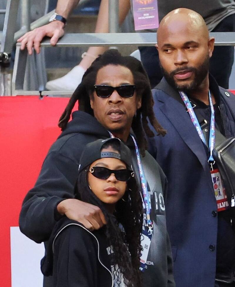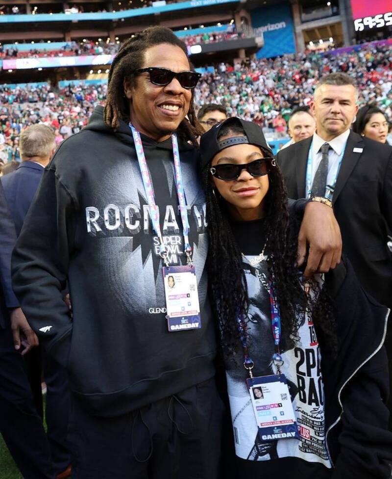 La pequeña de 11 años apareció al lado de su famoso padre, el rapero Jay- Z en el State Farm Stadium de la ciudad de Glendale, en Arizona que tiene una capacidad para 75 espectadores que disfrutan del partido entre Philadelphia Eagles y los Kansas City Chiefs.