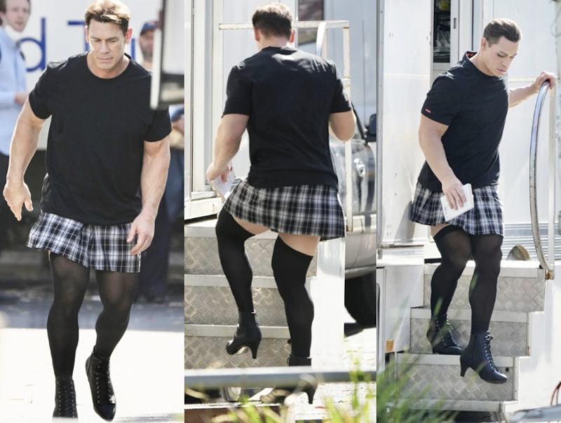 Este miércoles el nombre de John Cena se convirtió en tendencia luego de que fuera captado vestido de una manera poco habitual en él ya que se le vio con una mini falda, medias oscuras y tacones y pese a que sus fans estaban confundidos, todo parece indicar que todo es parte del rodaje de su nueva película.