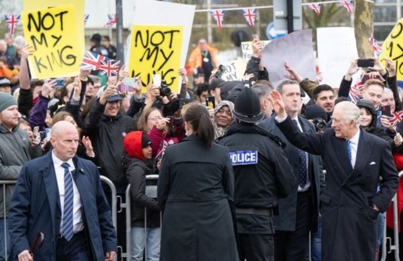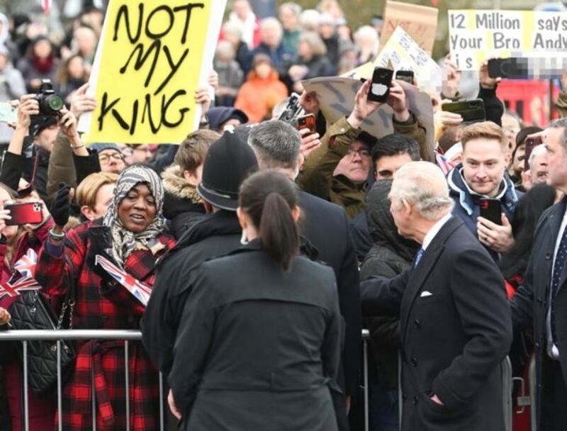 El rey Carlos III se encontró frente a frente con manifestantes antimonárquicos que sostenían carteles que decían "No es mi rey", durante una visita a la localidad de Milton Kaynes.
