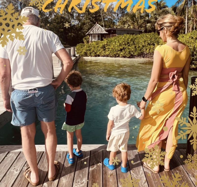 En la foto se ve a Silva con un vestido azul agua mientras camina descalza por la playa con sus dos hijos pequeños, durante una escapada familiar a un paraíso tropical. Mientras uno de los niños la toma de la mano, el otro corre emocionado hacia el mar.