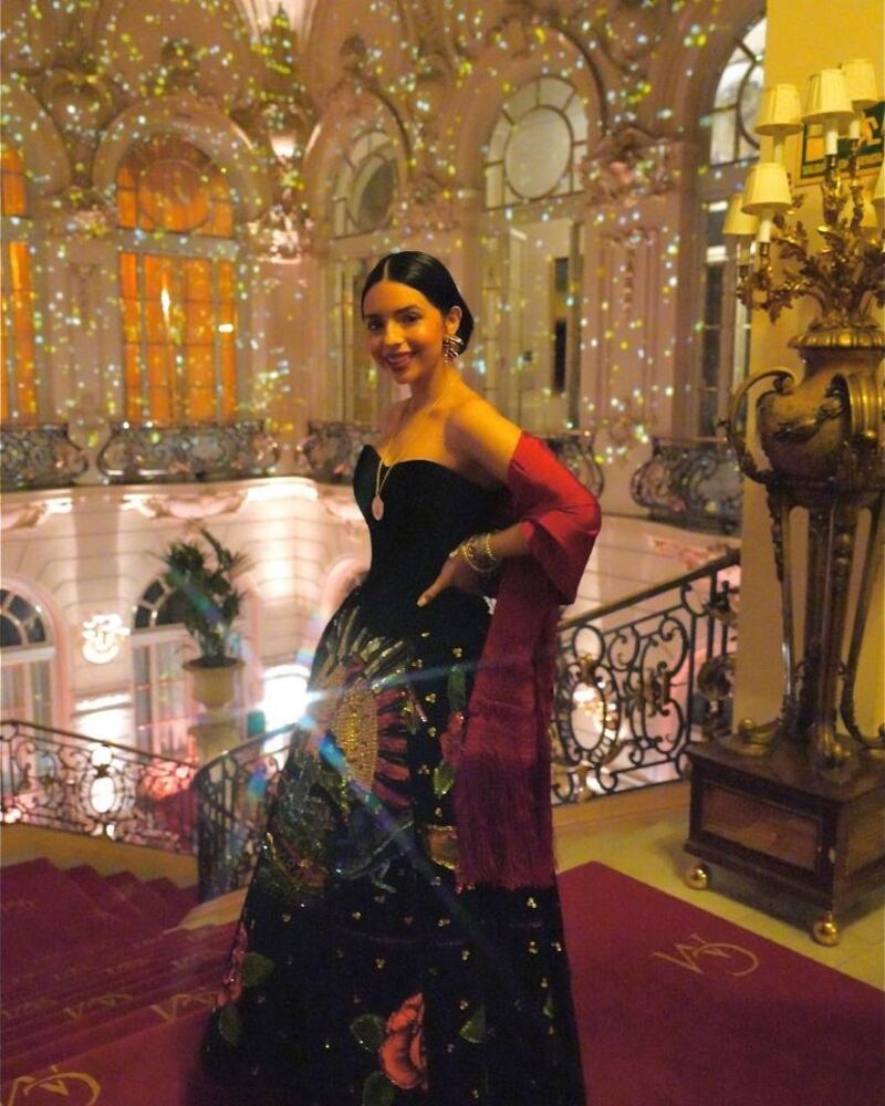 La intérprete presumió en sus redes sociales varias fotografías en la Real Academia de Bellas Artes de San Fernando, en Madrid, donde se llevó a cabo la ceremonia, luciendo un espectacular vestido de terciopelo negro con un bordado muy emblemático: una serpiente parada sobre un nopal, muy parecido al que trae la bandera nacional.