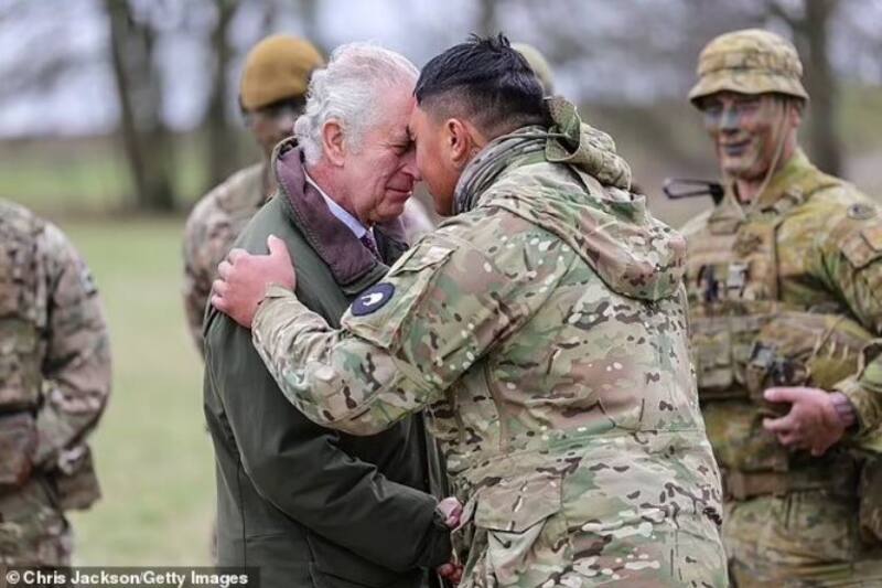 El monarca llegó al campo de entrenamiento vistiendo casual y muy abrigado, mientras estrechaba la mano de los reclutas se encontró con un soldado originario de Nueva Zelanda a quien no dudó en saludar de la manera tradicional de la etnia Maorí. Realizando el denominado “Hongi”, el rey Carlos III juntó su frente y nariz con el soldado.