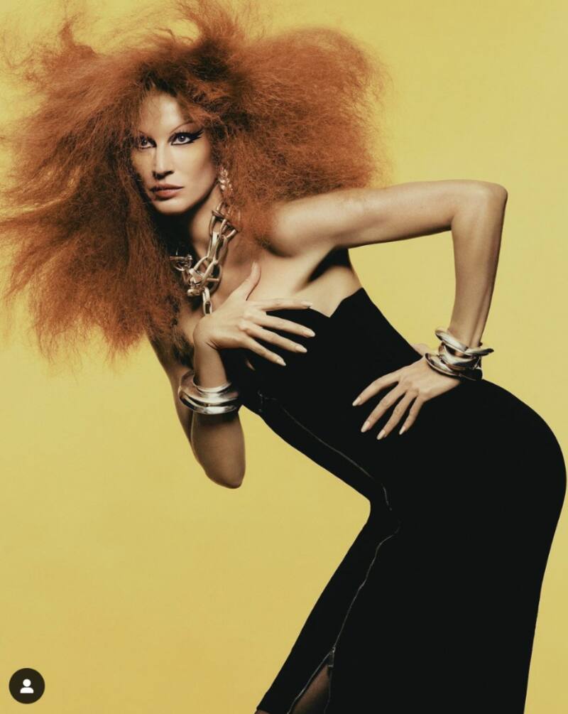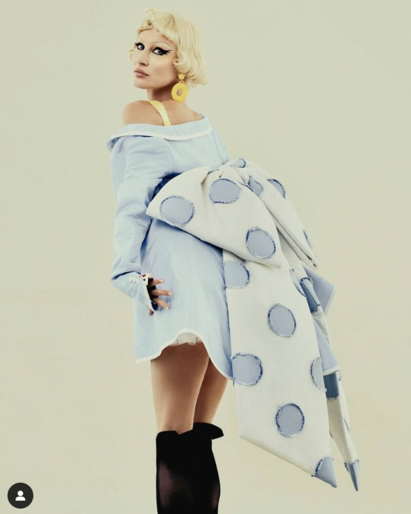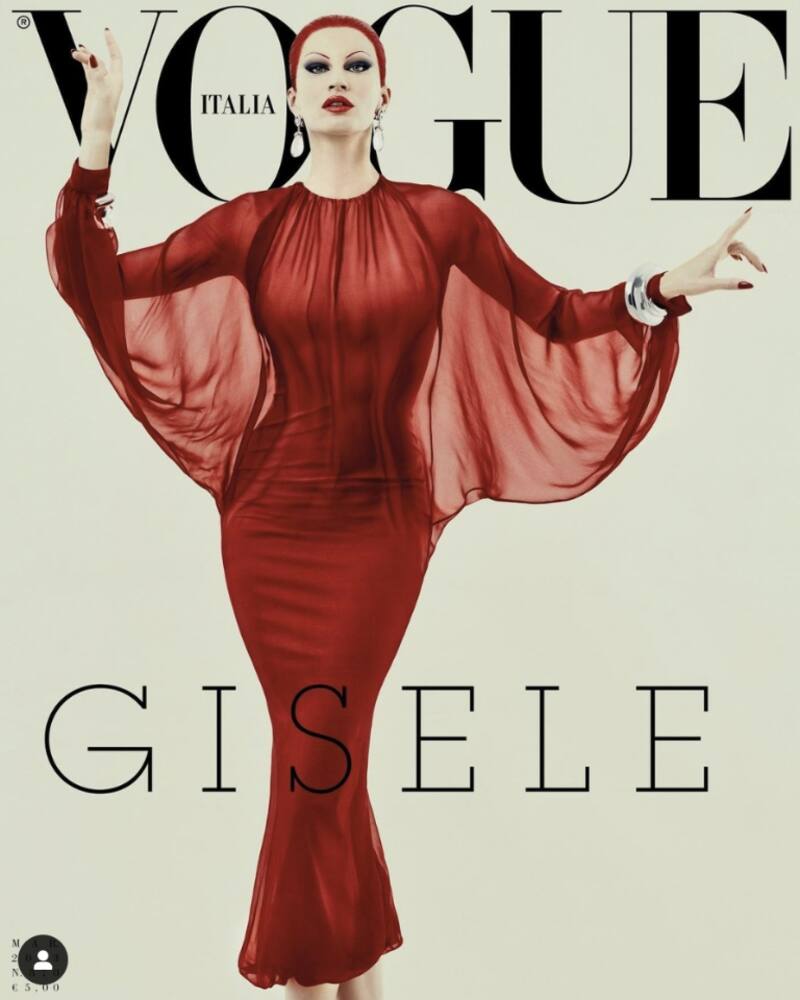 La ex modelo de Victoria's Secret protagonizó una original sesión de fotos del número de marzo de 2023 de Vogue Italia, en la que en la portada se le ve con un vestido rojo transparente de Valentino, peluca, cejas muy finas y sombra de ojos ahumada, recordando los icónicos looks de las drag queens.