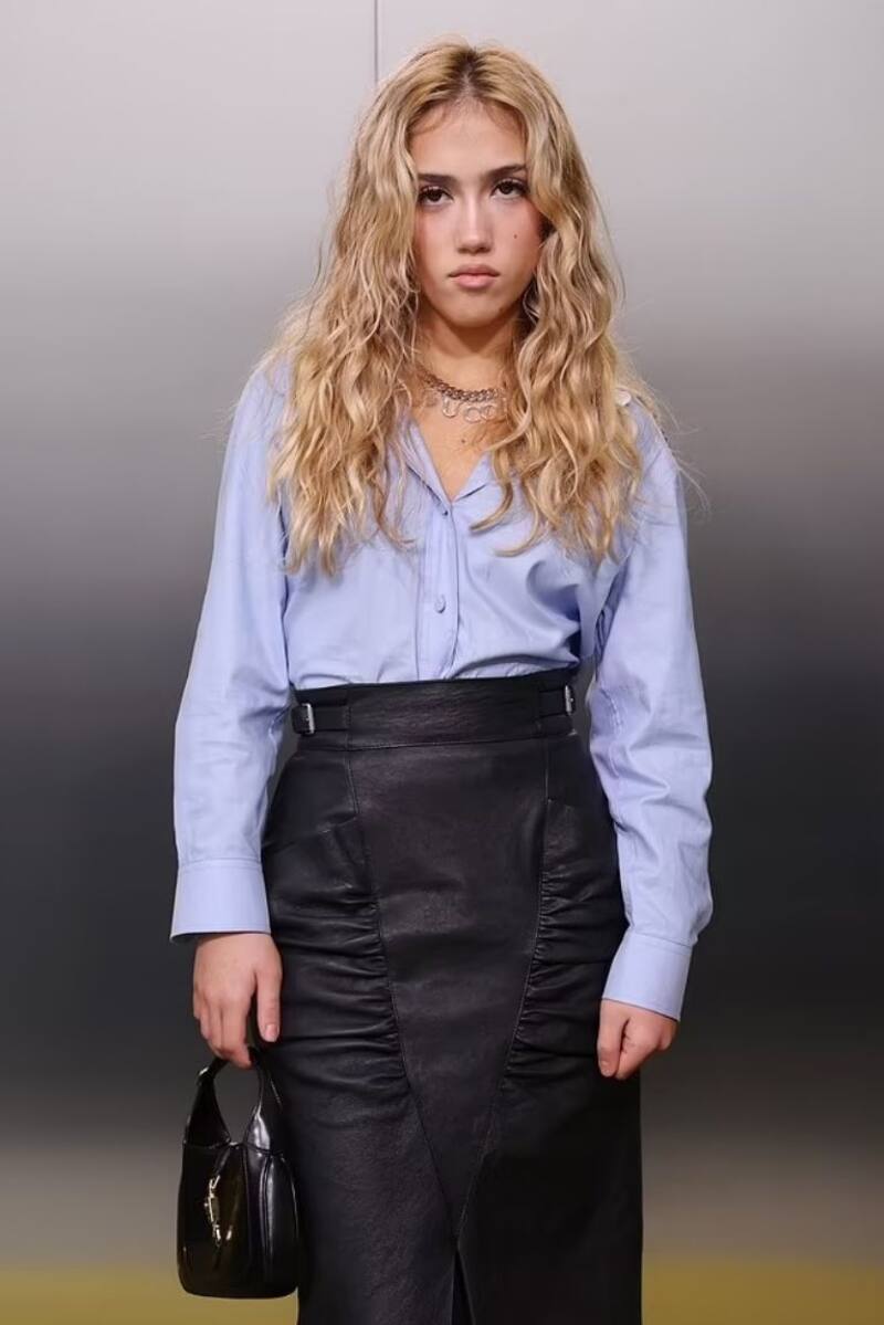 La adolescente decidió utilizar una elegante camisa azul con botones, combinada con una falda de cuero, calcetines Gucci y un par de tacones de plataforma. Además, utilizó un grueso collar de oro y un discreto bolso que combinaba con su falda. Valentina Pinault pareció no tener problemas en dejar registro de su paso por el evento y accedió a fotografiarse junto a su familia y en solitario.