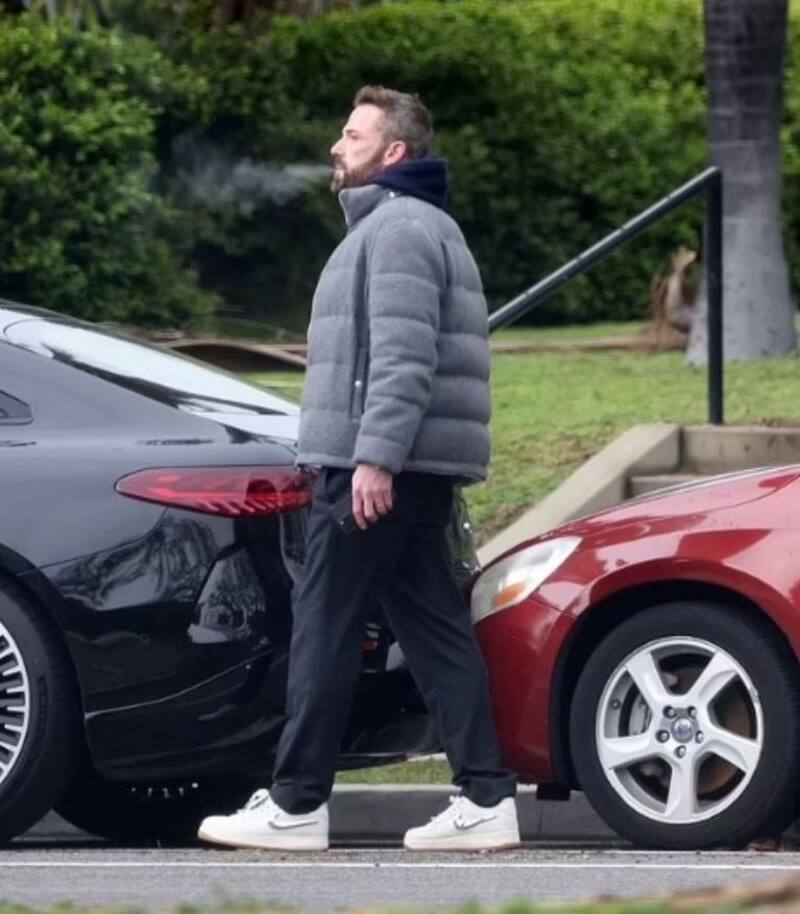 Vestido por completo de manera informal, con una sudadera con capucha negra y encima una chaqueta gris, más unos pantalones deportivos y unas tenis de calzado, Ben Affleck esperó sin éxito y optó por subirse a su automóvil e iniciar las maniobras de liberación de su coche para abandonar el lugar.