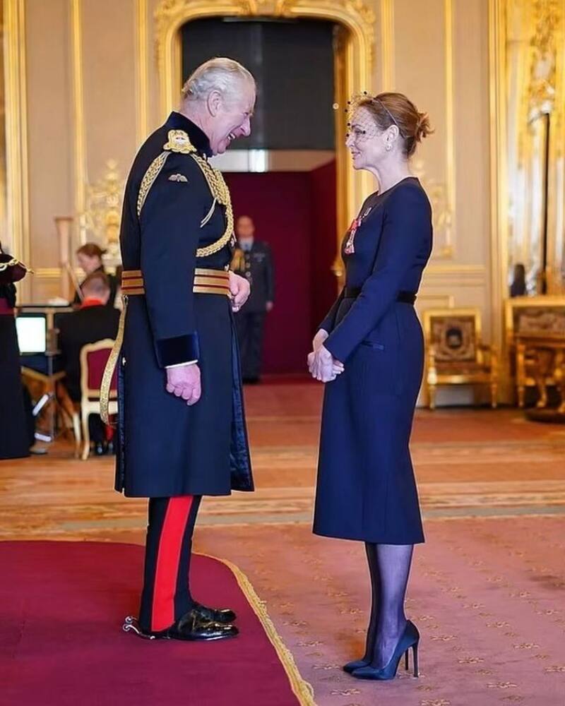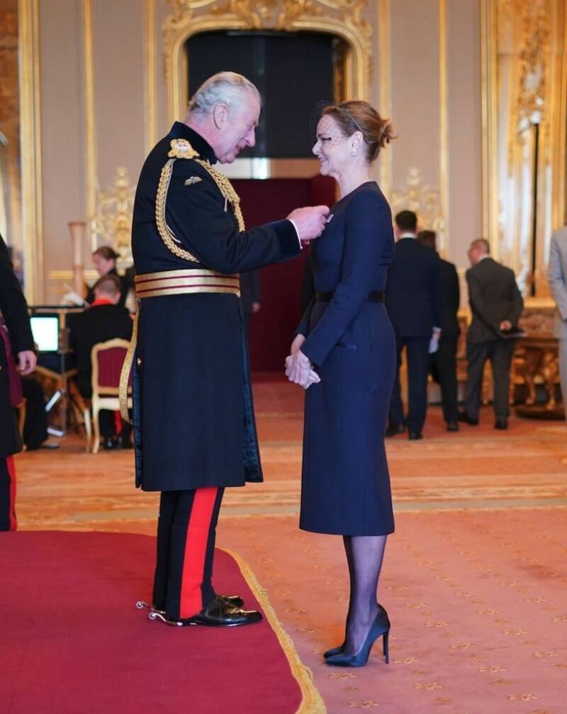 En una ceremonia realizada en el Castillo de Windsor, Su Majestad le entregó el premio a la estilista por su trabajo en la moda y sostenibilidad, ya que además de prestar sus servicios a la familia real comparte la visión del rey Carlos de cuidar el medio ambiente y sin afectar a animales en la producción de sus prendas.