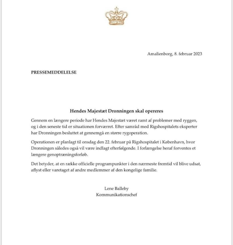 Recién comienza 2023 y la reina Margarita de Dinamarca (82 años) debe enfrentar problemas en su salud, ya que se dio a conocer que está sufriendo de la espalda y por ello deberá ser intervenida quirúrgicamente casi de manera urgente, así lo dio a conocer la Casa Real a través de un comunicado emitido en sus redes sociales.
