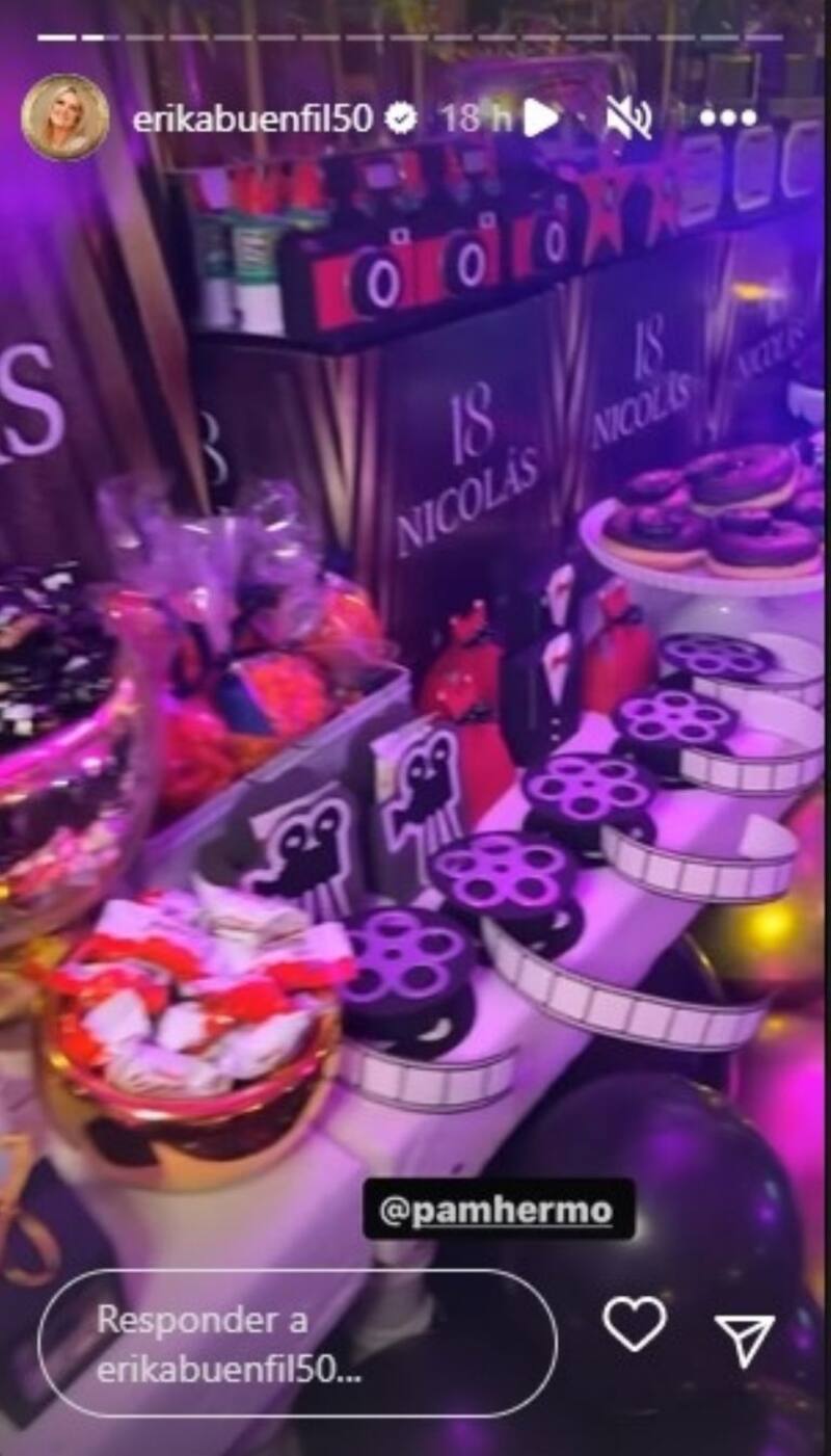 Dentro del enorme salón, Erika mandó a colocar letras gigantes con el nombre de Nico y una extensa mesa de dulces con varias degustaciones, todas alusivas al cine con claquetas, sillas para el director y algunas estrellas como las que se colocan en el Paseo de la Fama de Hollywood.