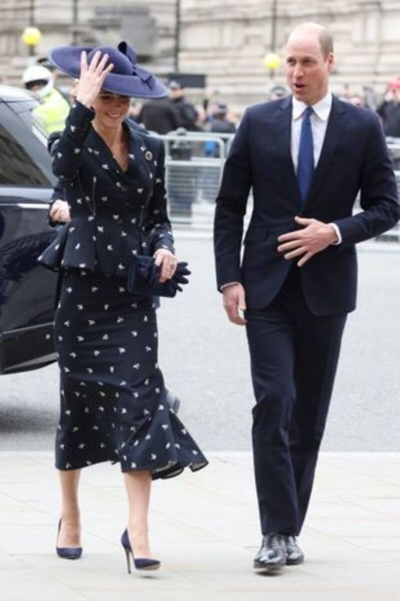 Kate Middleton lució un traje azul marino de Erdem y un broche con las plumas del Príncipe de Gales. La princesa también tuvo que sujetarse el sombrero cuando el viento casi lo hizo volar al ingreso a la Abadía.