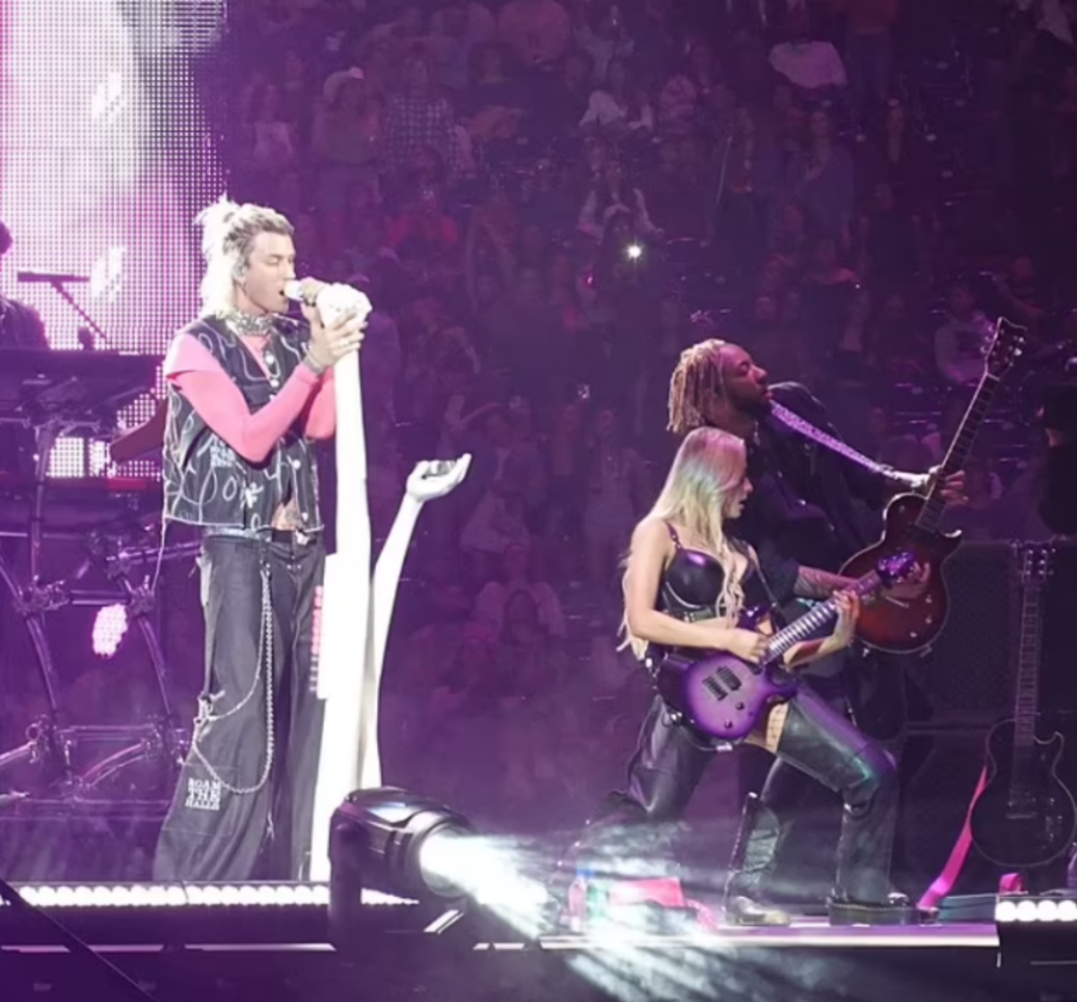 El rapero de 32 años subió a los escenarios junto a su equipo de músicos, entre ellos Sophie Lloyd, con quien se le vinculó en el pasado a raíz del polémico post de Megan que desató los rumores. Vestido con un atuendo rosado al estilo punk rock, MGK encendió a la multitud y preguntó a sus fanáticos: "¿Quieren que me mude a Texas? Podría hacerlo. Mi vida es un caos", reveló en medio del espectáculo.