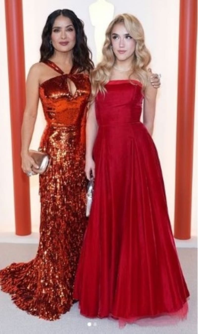 Salma Hayek (56) y su hija, Valentina Paloma (15), se convirtieron en tendencia la noche del pasado domingo tras su aparición en la alfombra champagne de los premios Oscars, pues ambas decidieron combinar sus looks; por una parte, la actriz lució un vestido de Gucci lleno de lentejuelas, mientras que la adolescente optó por usar un vestido reciclado.