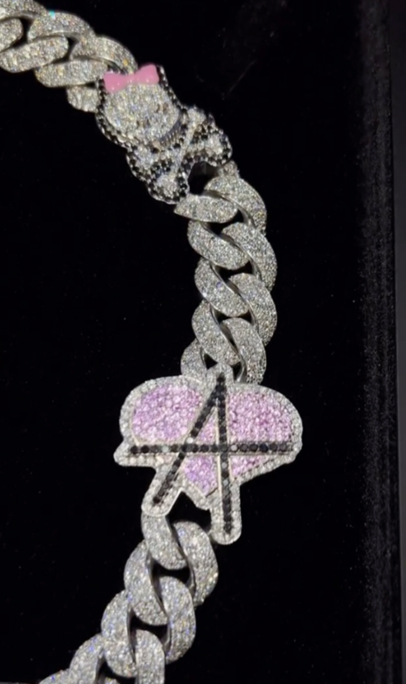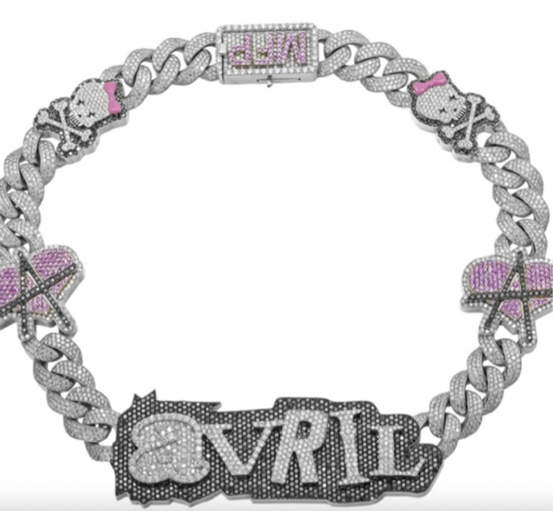 Fue el propio Mavani quien explicó al medio que la cadena tiene 50 quilates de diamantes negros, blancos y zafiros rosas, que lleva escrito el nombre de Lavigne, un par de letras A escritas sobre corazones rosas y dos cabezas de calavera con huesos cruzados debajo y moños rosas.