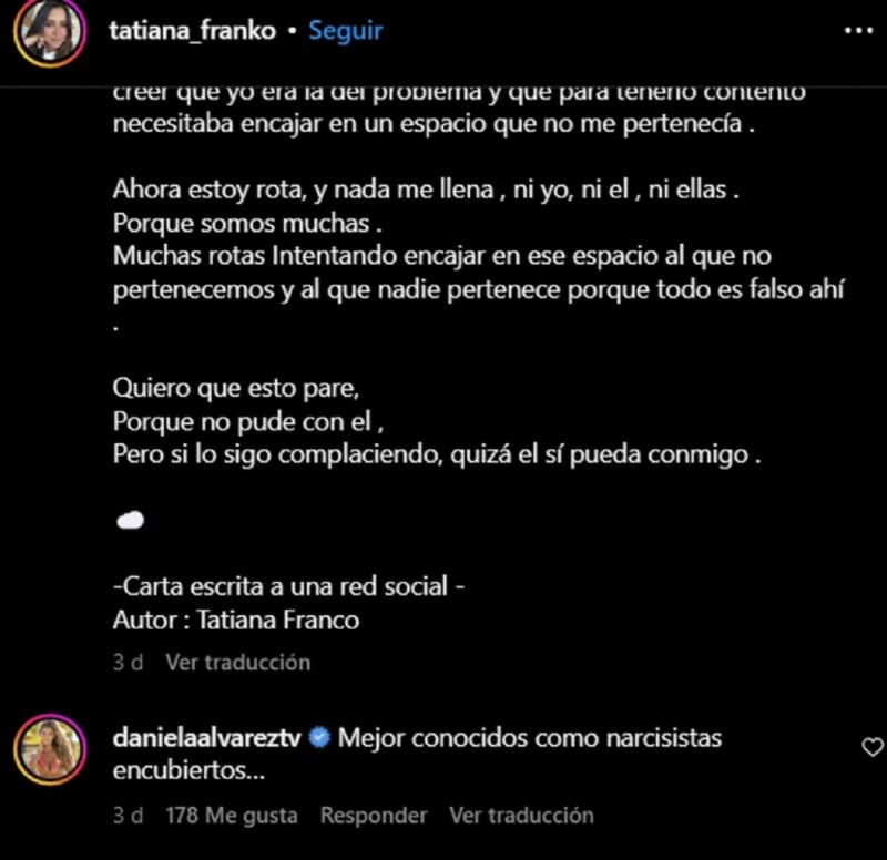 Al respecto, Álvarez contestó confirmando la situación y dejó un comentario que el público interpretó como una indirecta hacia Arenas : “Mejor conocidos como narcisistas encubiertos”.