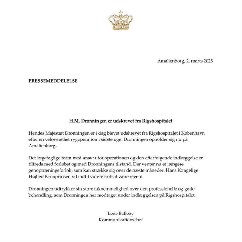 “Su Majestad la Reina ha sido dada de alta de Rigshospitalet en Copenhague hoy después de una exitosa operación de espalda la semana pasada. La Reina ahora reside en Amalienborg. El equipo médico responsable de la operación y la subsecuente hospitalización está satisfecho con el proceso y con la condición de La Reina” dice una primera parte del documento.