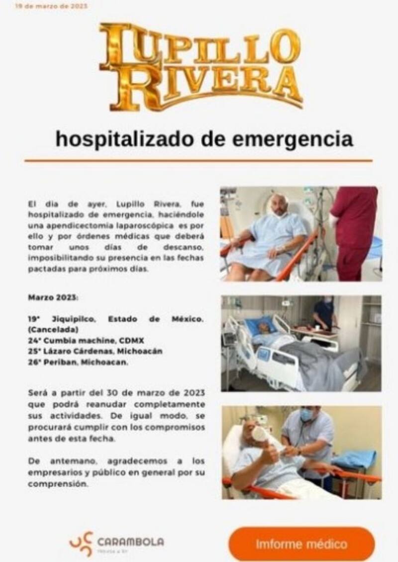 Durante este fin de semana, Lupillo Rivera (41) emitió un comunicado en sus redes sociales en el que indicaba la cancelación de sus presentaciones, debido a un grave problema de salud que lo obligó a entrar a la sala de quirófano, razón por la que ha estado hospitalizado.
