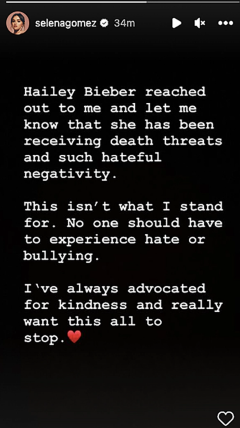 Mediante una storie de Instagram, Gomez se refirió a sus 400 millones de seguidores para pedir un alto al odio e intimidación que ha estado viviendo la modelo desde el inicio de la polémica. “Hailey Bieber se acercó a mí y me hizo saber que ha estado recibiendo amenazas de muerte y una negatividad tan odiosa”, declaró.