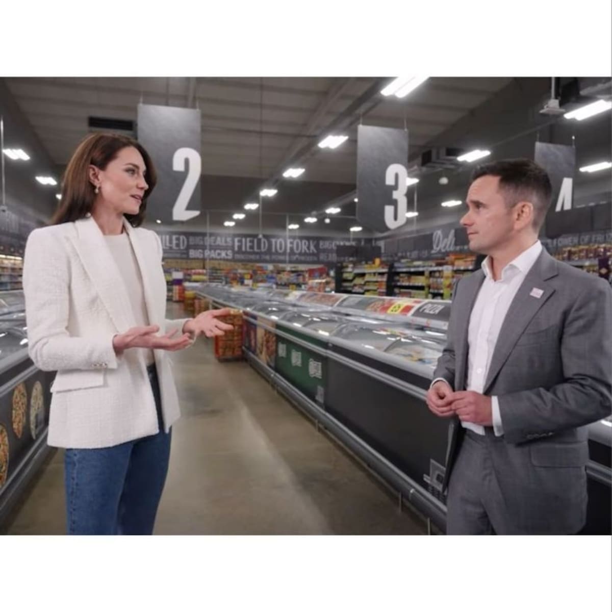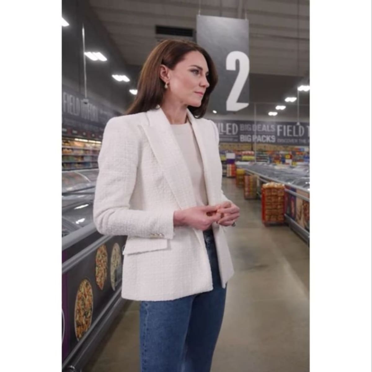 La mamá de Charlotte, Louis y George, utilizó unos jeans azules de corte recto con una playera blanca de cuello redondo y un saco blanco en color crema con bolsos a los costados y botones en color dorado, de acuerdo con Hola!, se trata de una prenda de Zara que cuesta menos de 65 dólares. Complementó su look con unos tenis blancos para no desentonar con su conjunto.