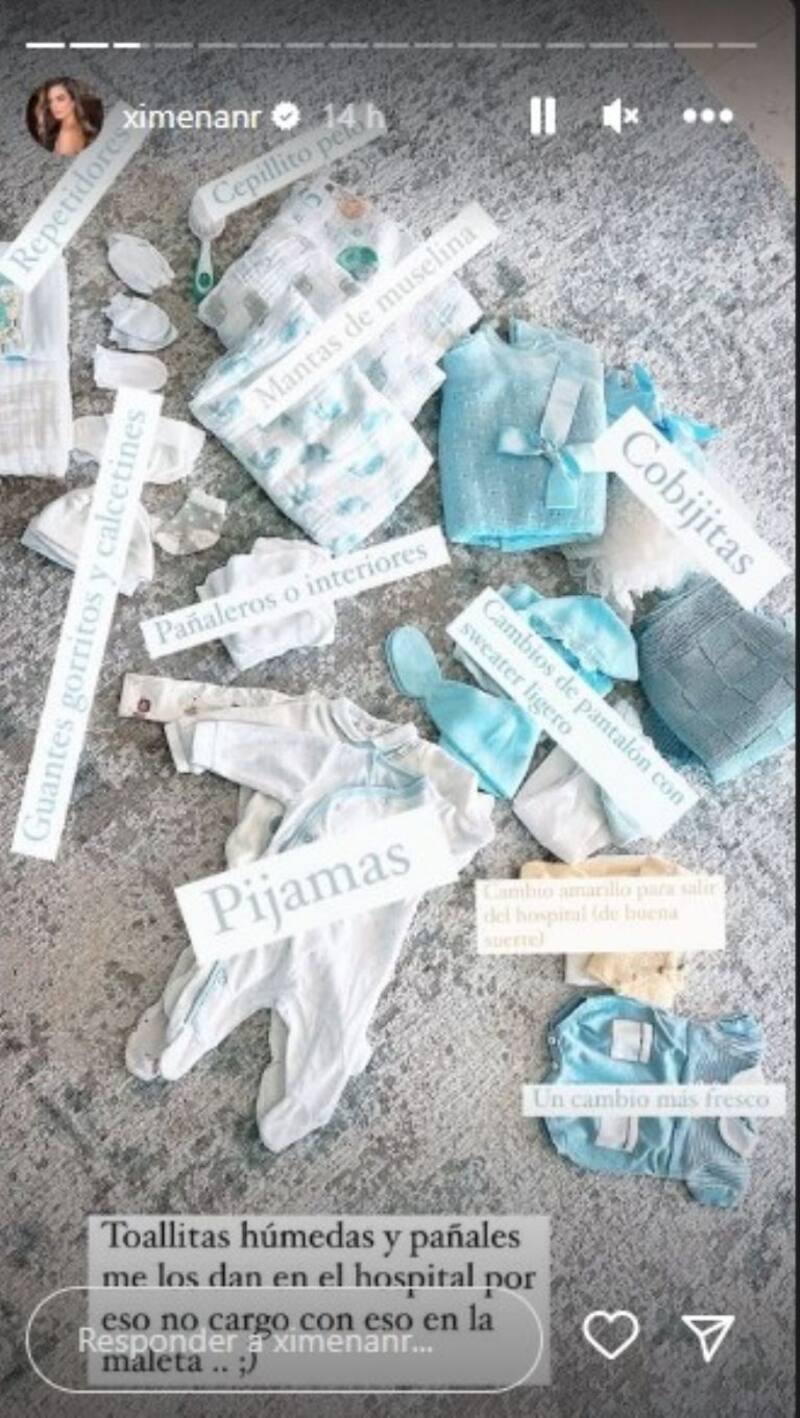 En una primera imagen se ve una pequeña maleta blanca que pertenece a su hijo, dos más grandes para ella y un letreo hecho especialmente para los datos de su nacimiento y sea más fácil de checar por los doctores y en una segunda fotografía se puede ver el contenido de la bolsa con ropa en blanco con azul pero también uno amarillo.