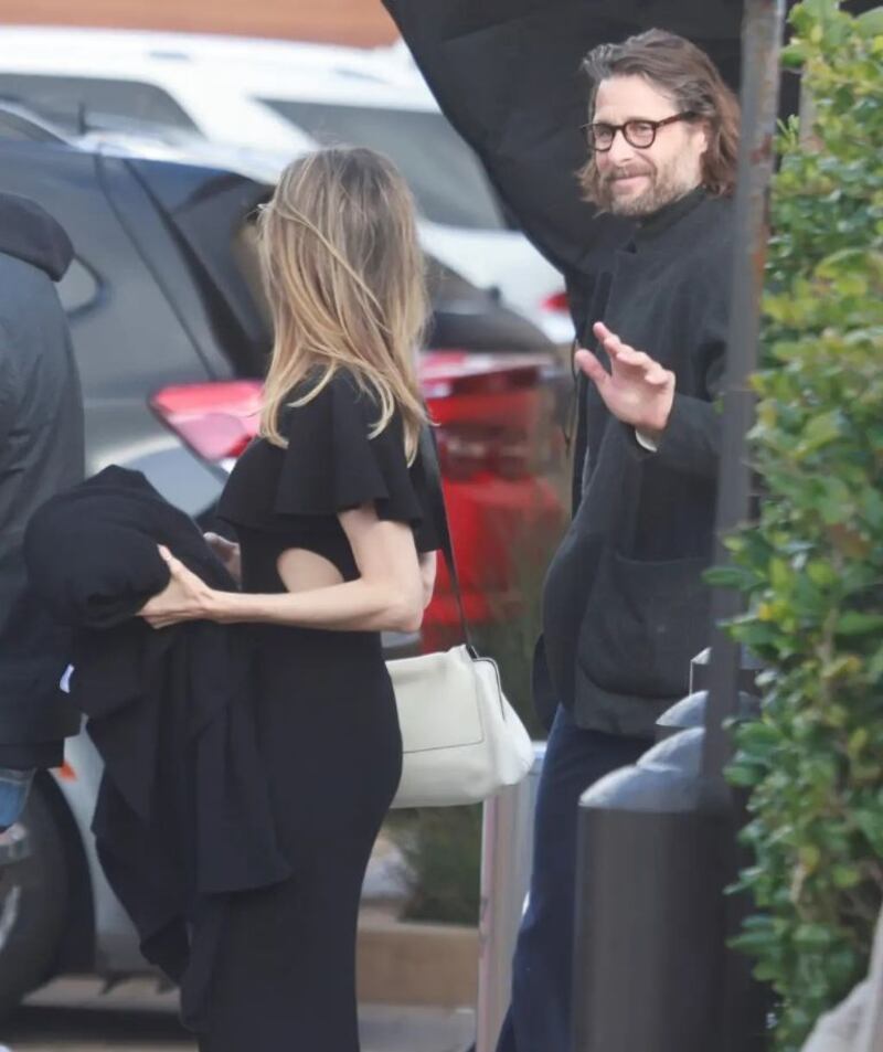 La actriz complementó su look con el cabello suelto, unos stiletto en color negro y lentes de sol. Por su parte, Mayer de Rothschild vestía un pantalón azul marino, una camisa gris, una chaqueta, mocasines negros y divertidos calcetines de rayas.