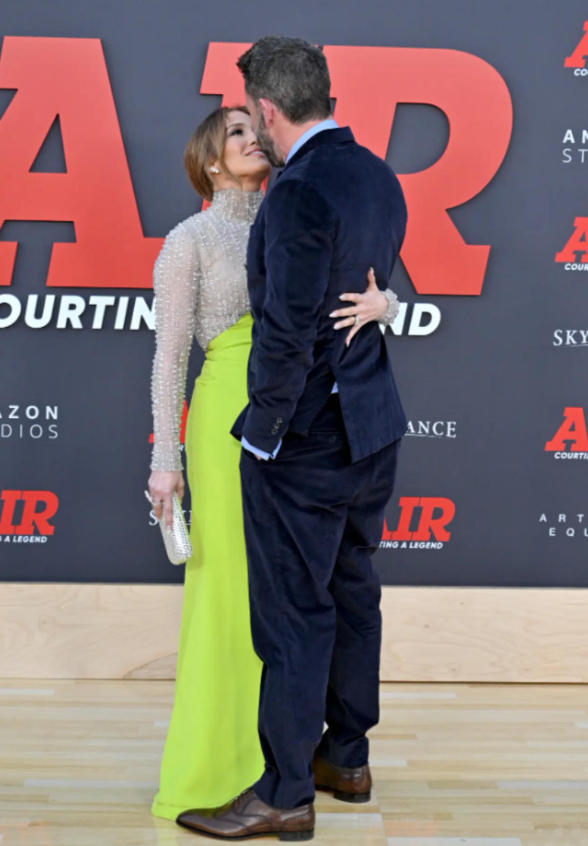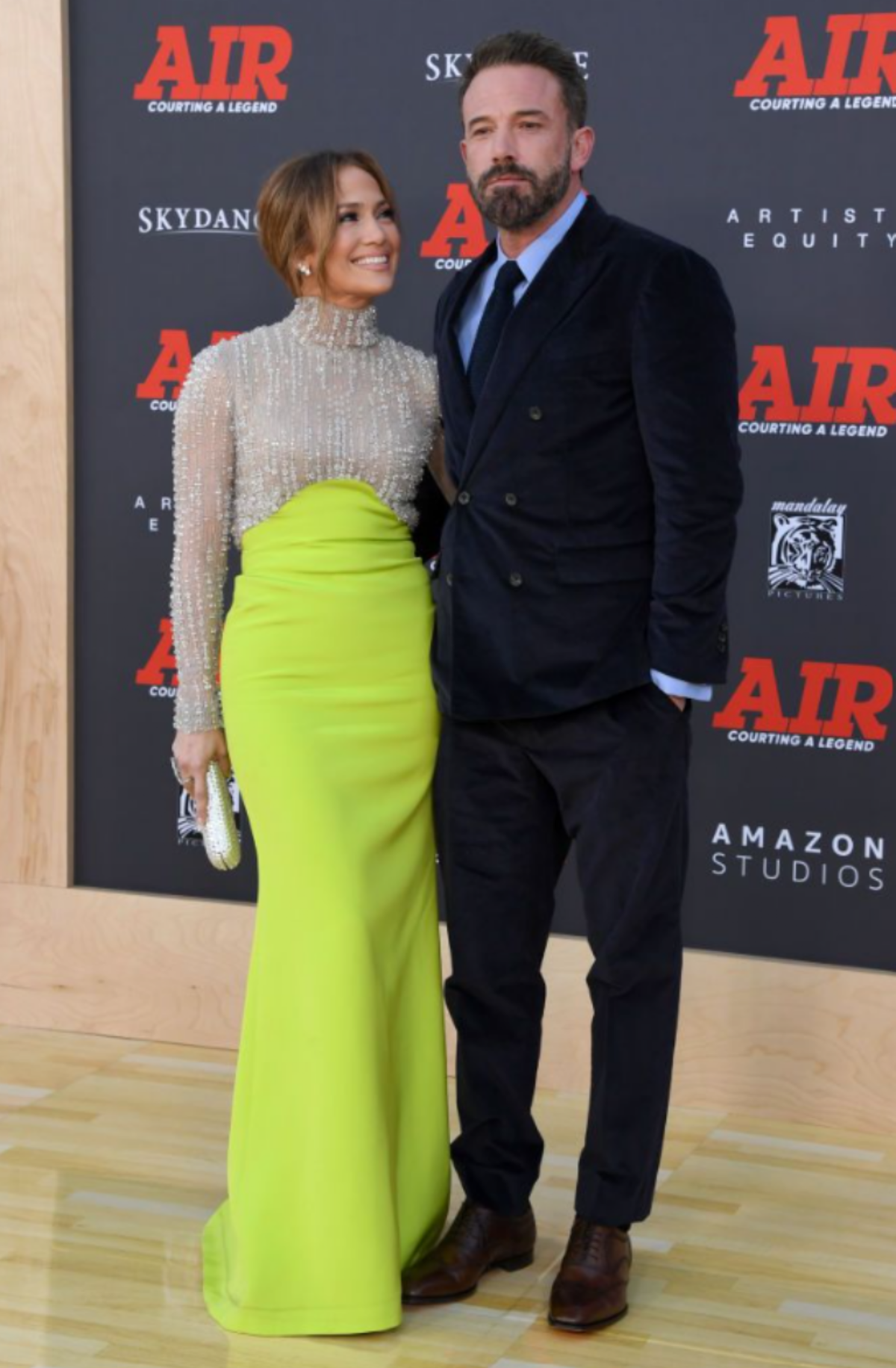 Lopez se presentó con un vestido verde neón acompañado de un conjunto blanco cubierto de brillantes perlas, las que combinó con un bolso de manos y anillos de la misma tonalidad. Affleck, por su parte, optó por el terciopelo azul marino en un traje abotonado junto a una camisa celeste.