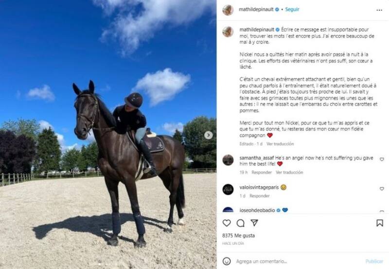 A través de su cuenta oficial de Instagram, la modelo compartió con sus miles de seguidores que está de luto por la muerte de su caballo, Nickel, y a quien consideraba como “fiel compañero”. En un post, Mathilde recalcó las dificultades que tuvo el animal y que lo llevaron al lamentable deceso.