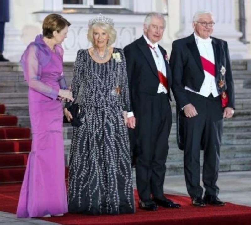 La esposa del rey Carlos III brilló con su corona cuando asistió a la cena de celebración de su visita a Alemania, horas después de que ambos soberanos aterrizaran en Berlín y fueran recibidos con honores militares en la Puerta de Brandenburgo.
