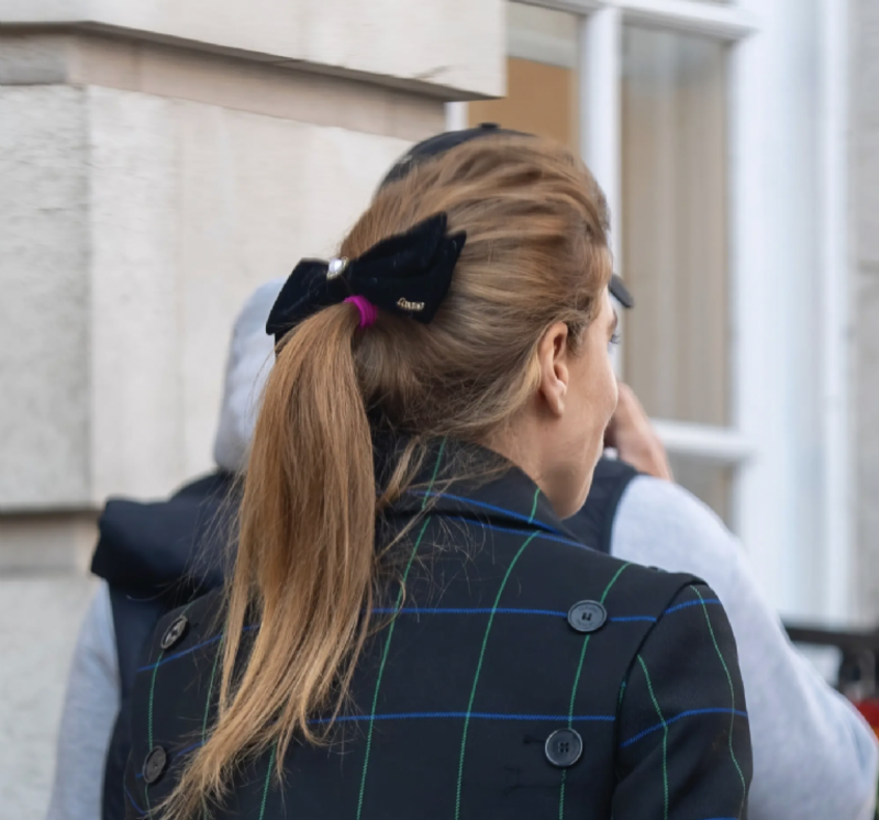 El accesorio además estaba decorado con las palabras "love me" en dorado, y el peinado emula a los que usaba su mamá cuando aún estaba casada con el príncipe Andrés.