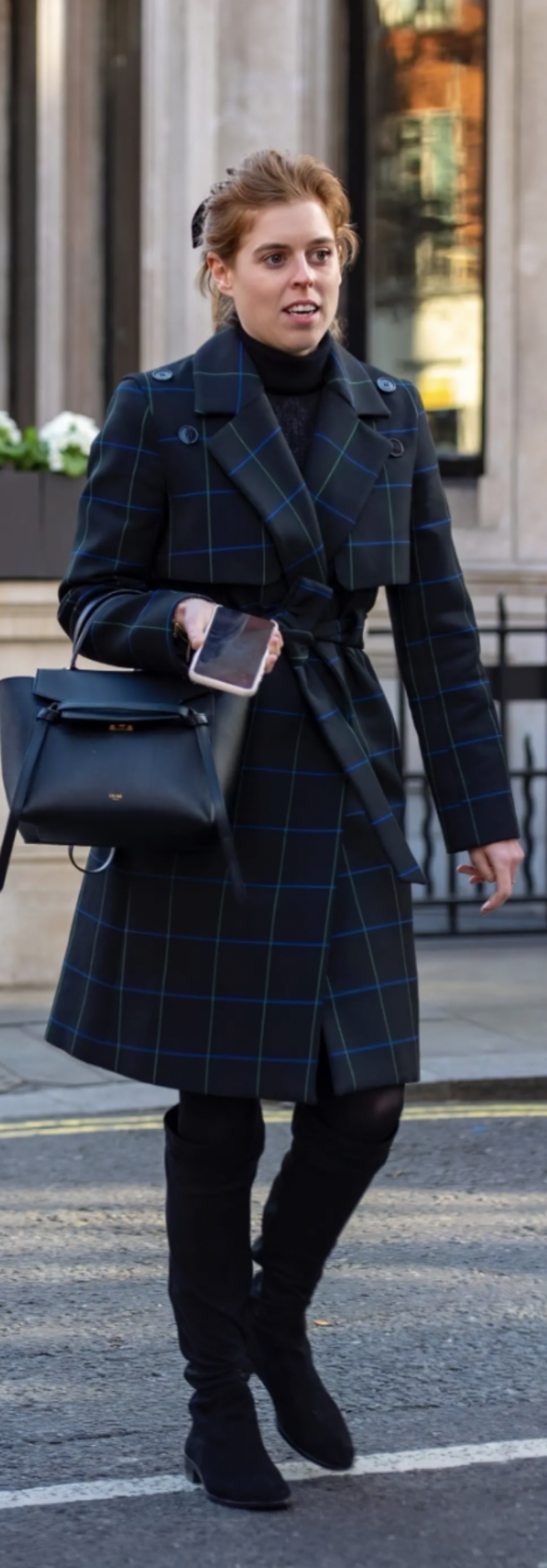 Portando una gabardina Claudie Pierlot, un par de botas negras y un bolso cinturón de Celine, la princesa adornó su peinado con un moño de terciopelo negro mientras paseaba por el barrio londinense de Mayfair.