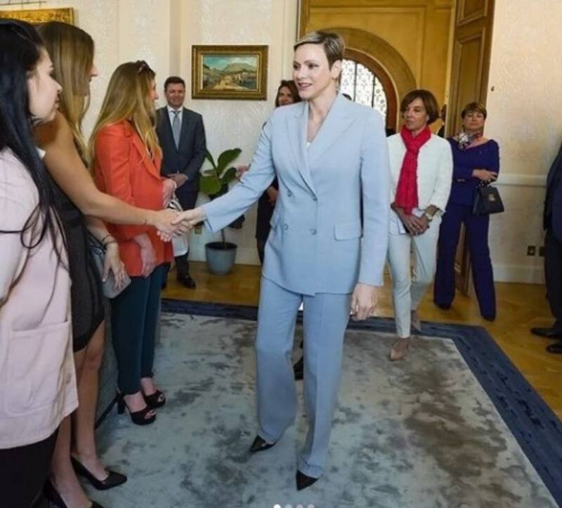Para la reunión, Charlene exhibió su versión de 'funcionaria' luciendo un traje de chaqueta en color azul claro, una blusa blazer de corte masculino y doble abotonadura. Esto lo combinó con un pantalón de líneas rectas al tono y unos sencillos zapatos de punta redonda en color negro.