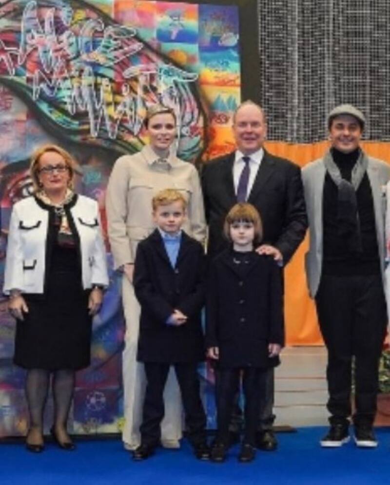 Por la tarde, Charlene apareció con el príncipe Alberto para presentar oficialmente al público el trabajo artístico colectivo de Mr One Teas, realizado con 100 escolares. Allí estuvieron también presentes el príncipe heredero Jacques y la princesa Gabriella.