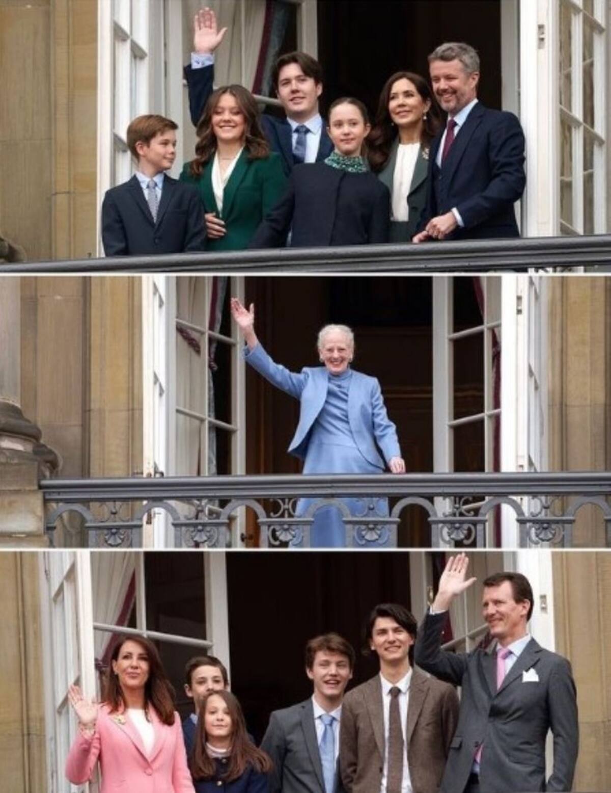 La reina Margarita II, que al inicio apareció sola en el balcón, consiguió que la coreografía quedara perfecta cuando después se asomó toda la familia del príncipe heredero Federico para saludarla, e inmediatamente después, el príncipe Joaquín con su familia completaron el cuadro.